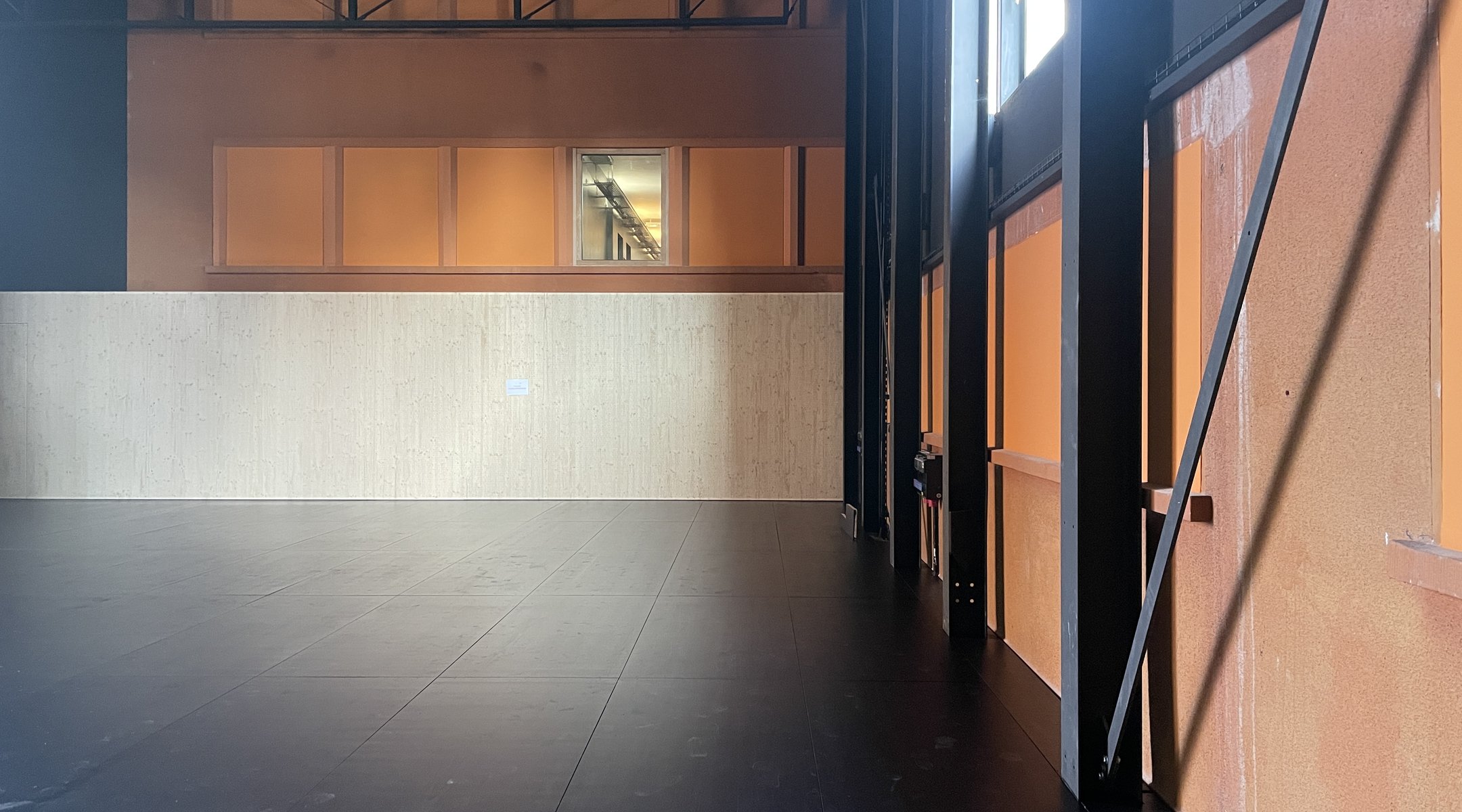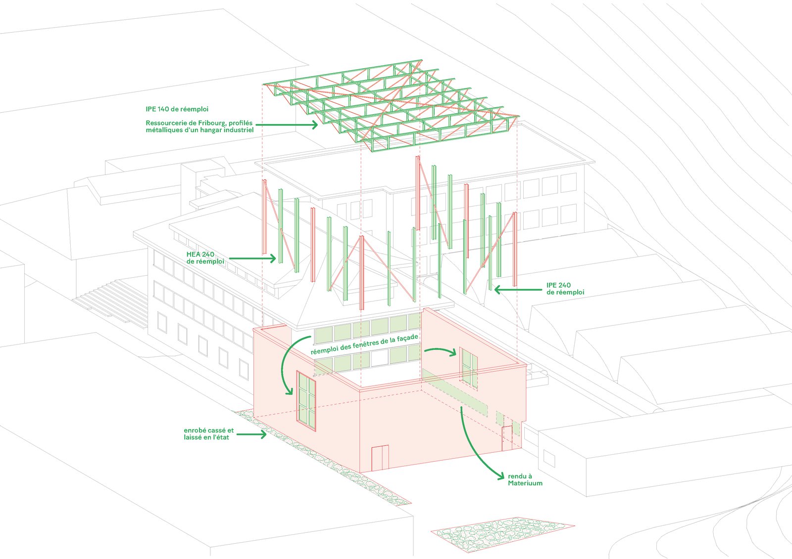 La structure principale du bâtiment en poutre métallique en provenance de la Ressourcerie (FR) est réemployée à 80% et laissée visible.