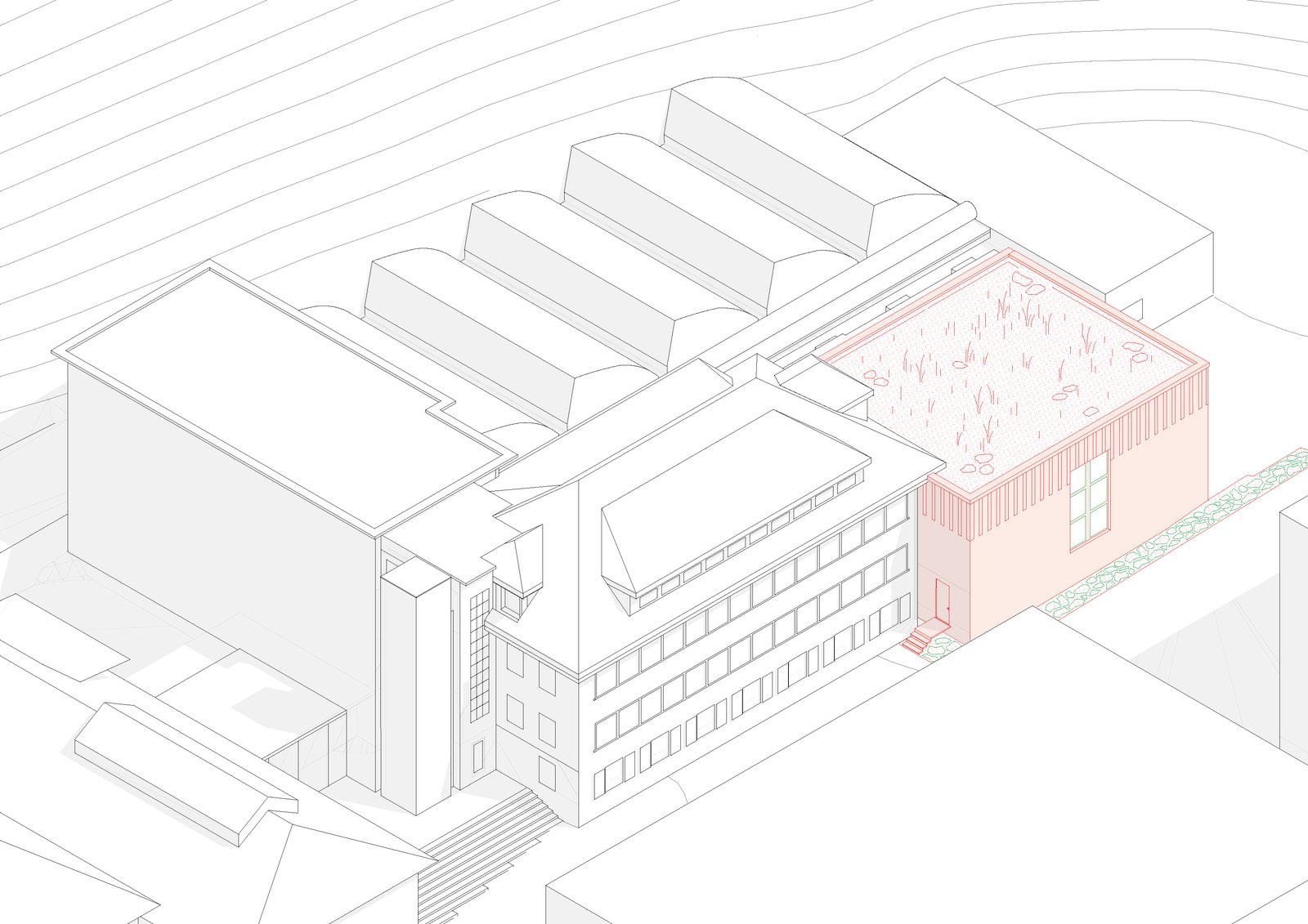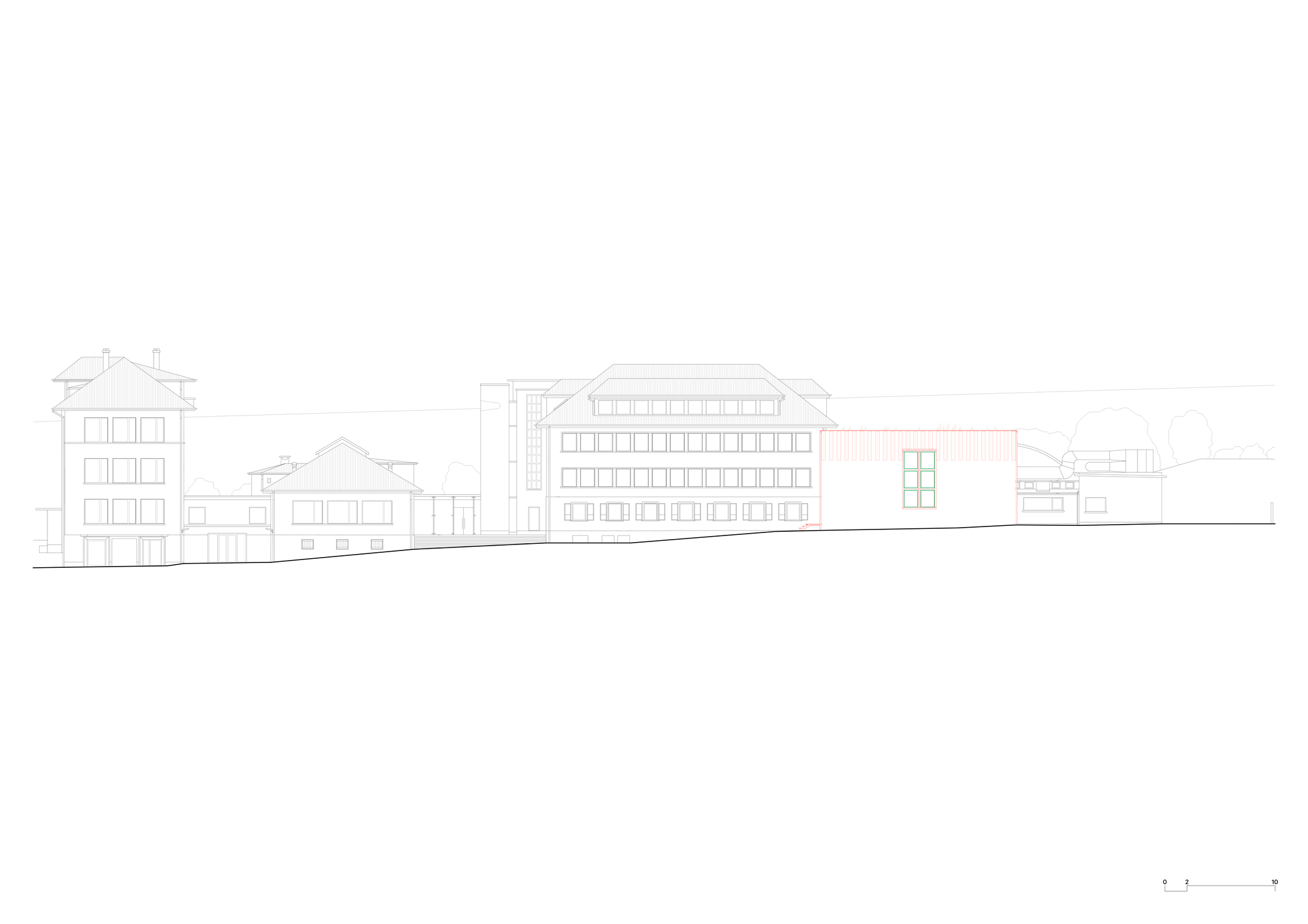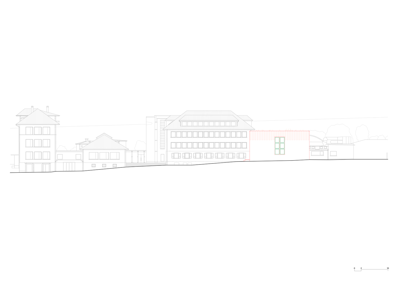 Dans une logique de cohérence de l’ensemble bâti, le nouveau volume se glisse sous la corniche du bâtiment existant afin de ne pas intervenir sur celui-ci. Sa toiture est plate et s’exprime comme un volume de transition permettant à terme une extension à l’est.