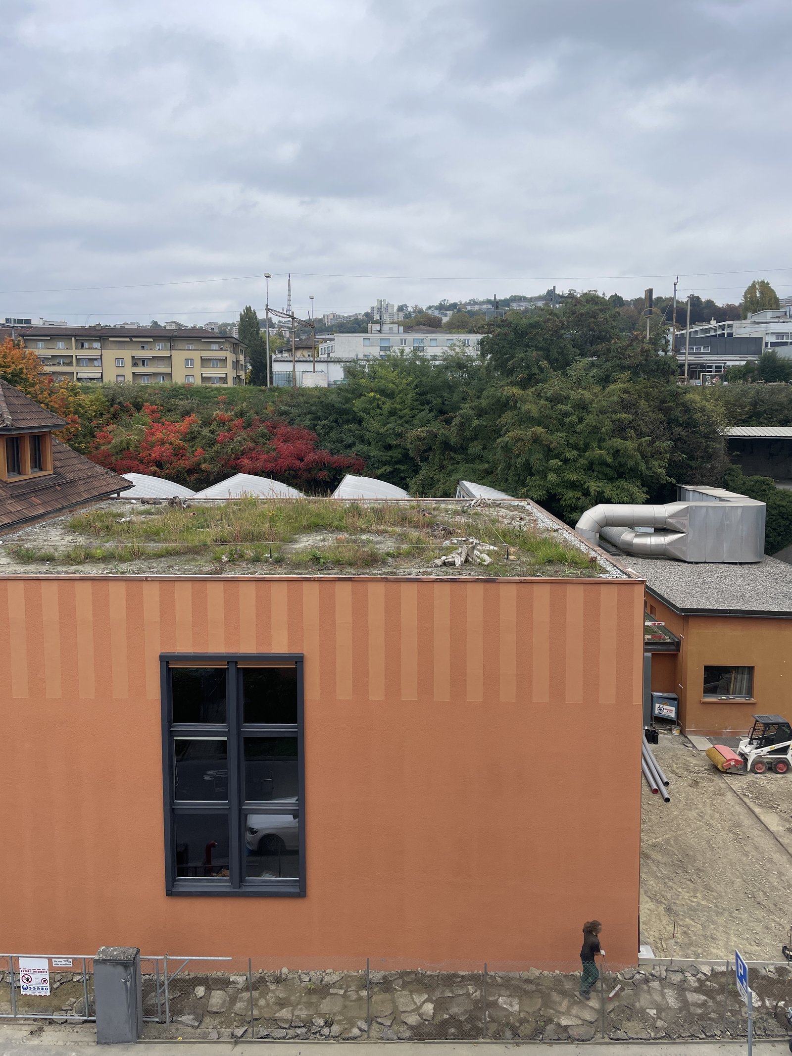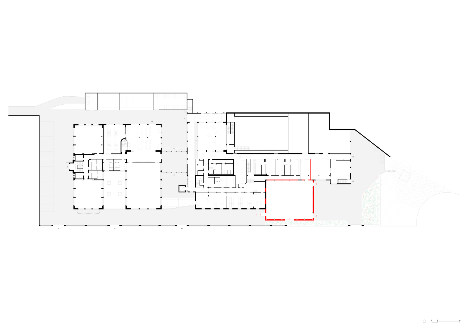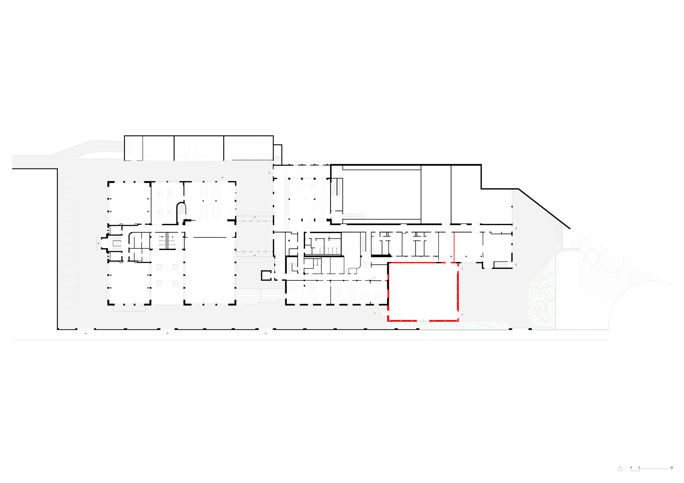 Dans une logique de cohérence de l’ensemble bâti, le nouveau volume se glisse sous la corniche du bâtiment existant afin de ne pas intervenir sur celui-ci. Sa toiture est plate et s’exprime comme un volume de transition permettant à terme une extension à l’est.