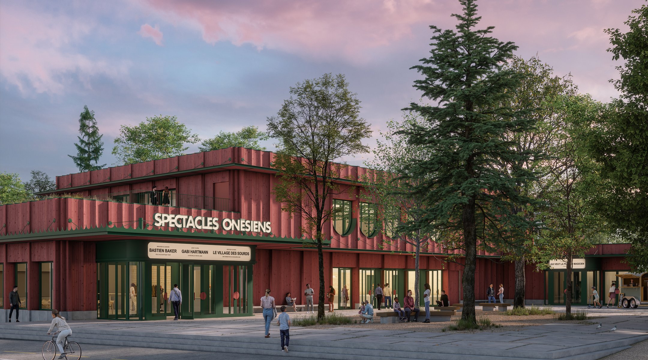 La façade du bâtiment, par son revêtement et ses ouvertures, évoque les rideaux de scènes et invite les Onésien.ne.s à assister aux spectacles.