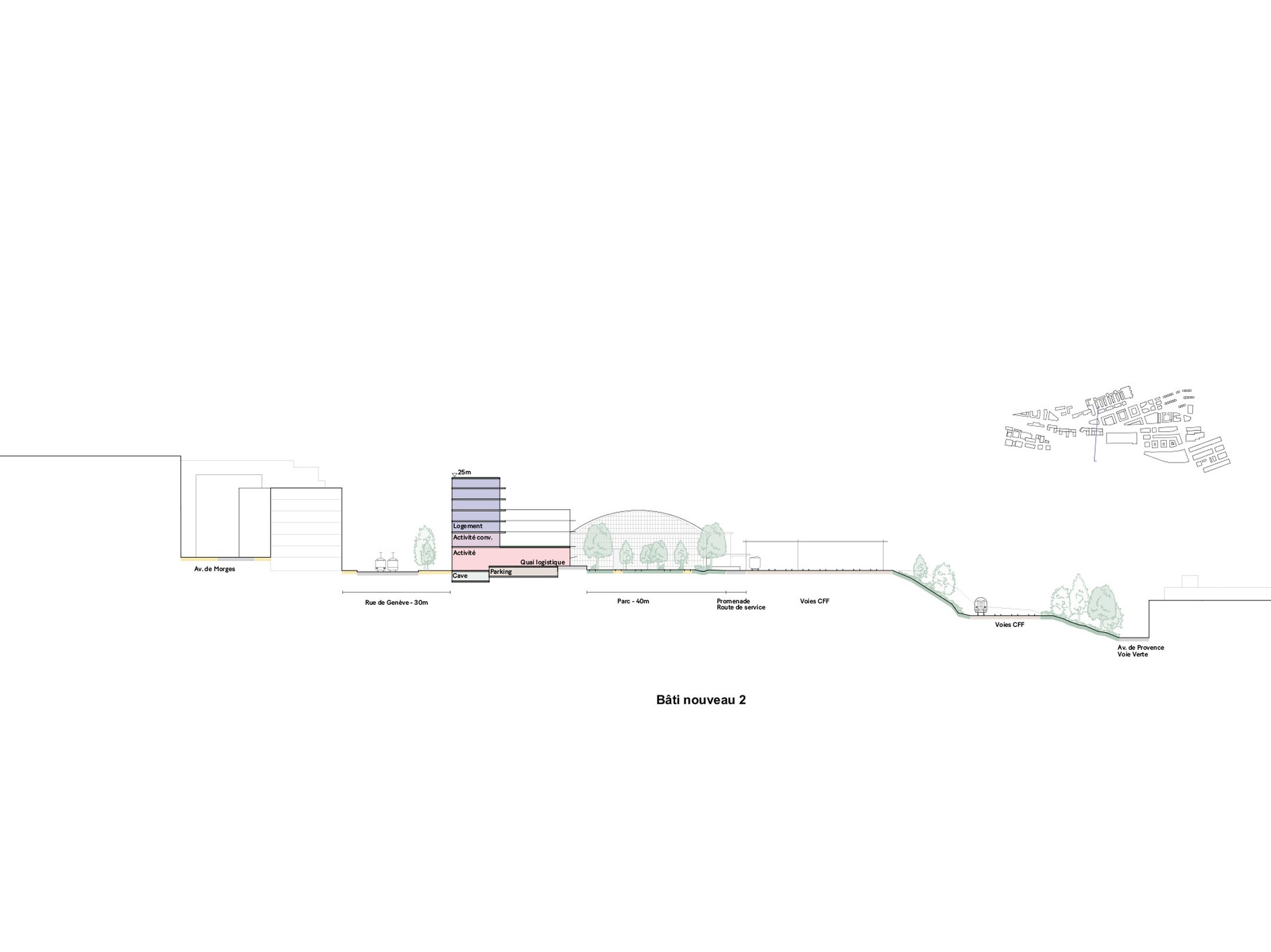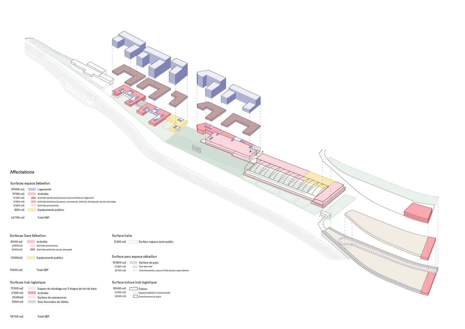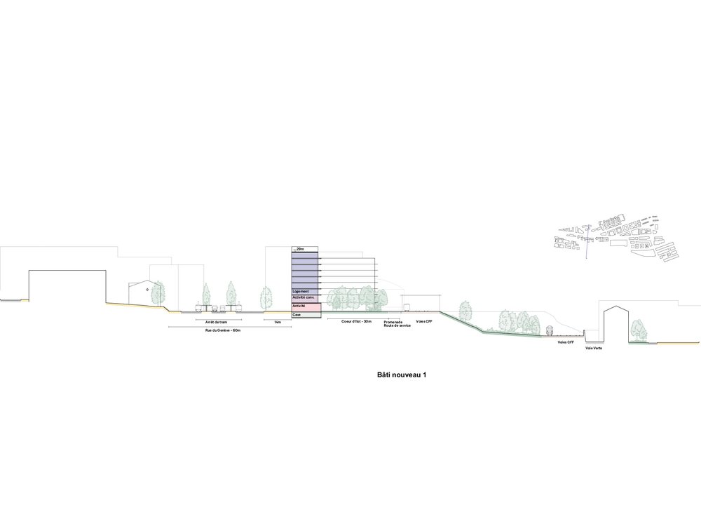 L’objectif est d’atteindre environ 50'000m2 de surface brute de plancher dont 2/3 de logements, de proposer une solution pour un futur hub logistique et de prévoir des espaces publics dont un parc d’environ 5000m2.