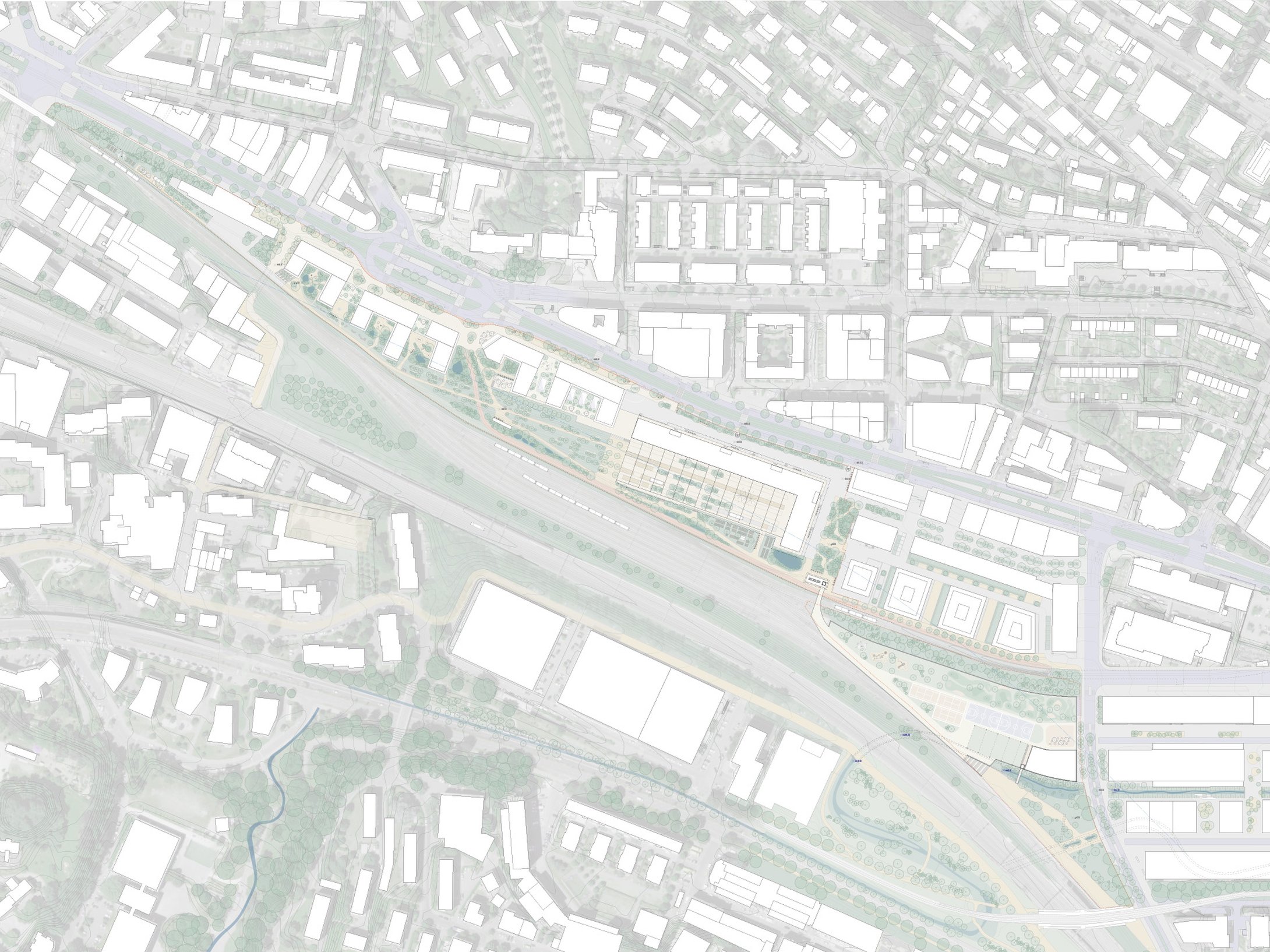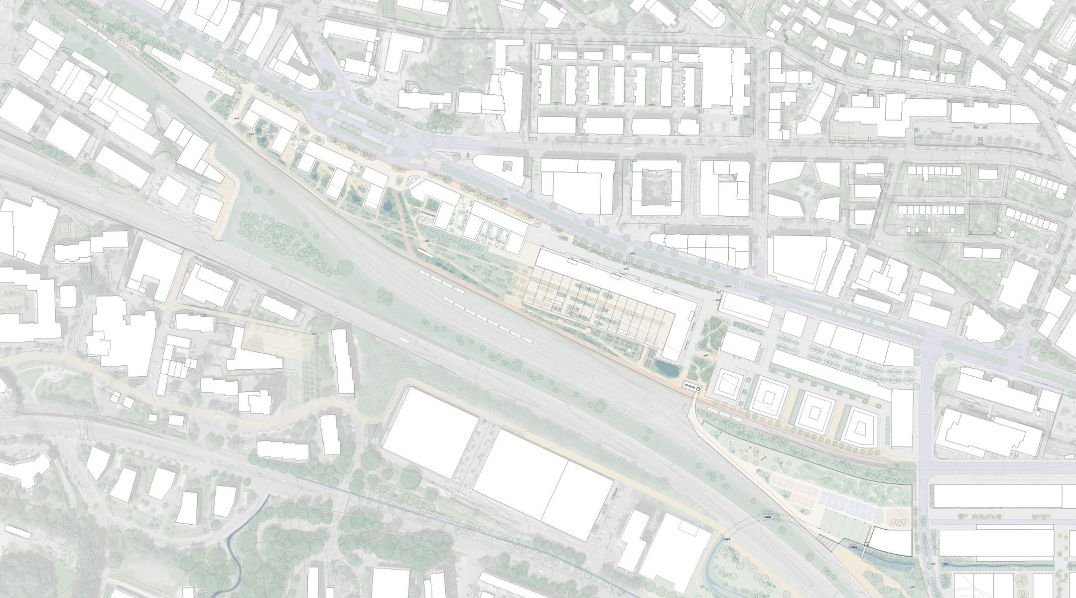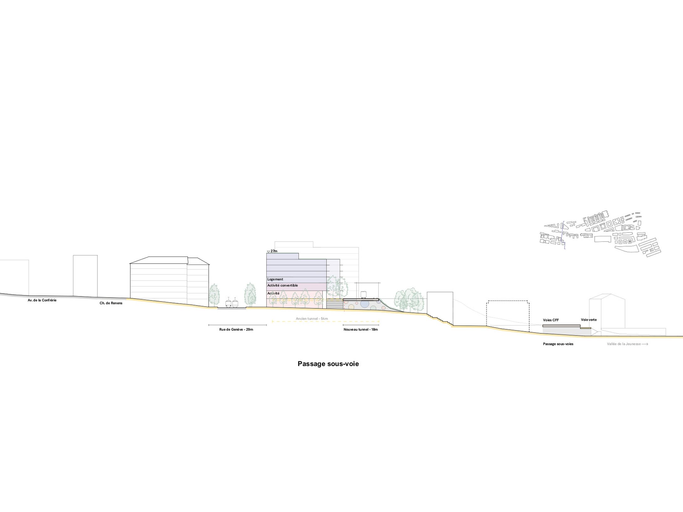 L’objectif est d’atteindre environ 50'000m2 de surface brute de plancher dont 2/3 de logements, de proposer une solution pour un futur hub logistique et de prévoir des espaces publics dont un parc d’environ 5000m2.