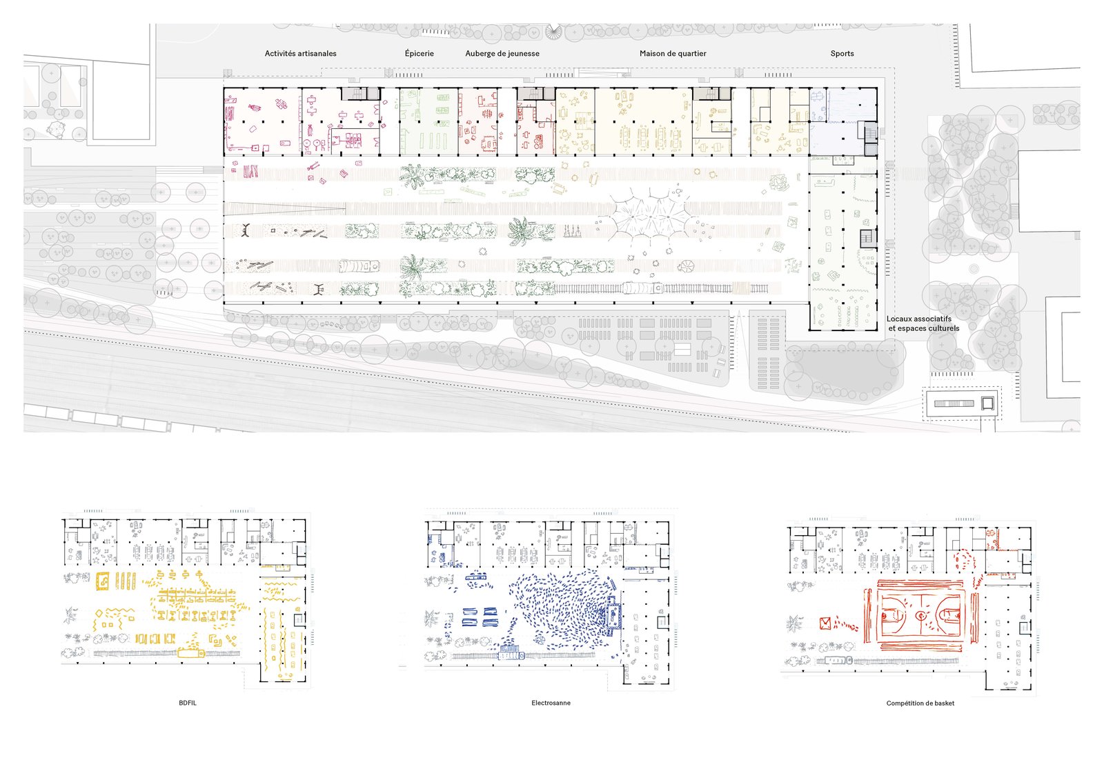 plan rez-de-chaussé et scénario d'occupation de la Halle