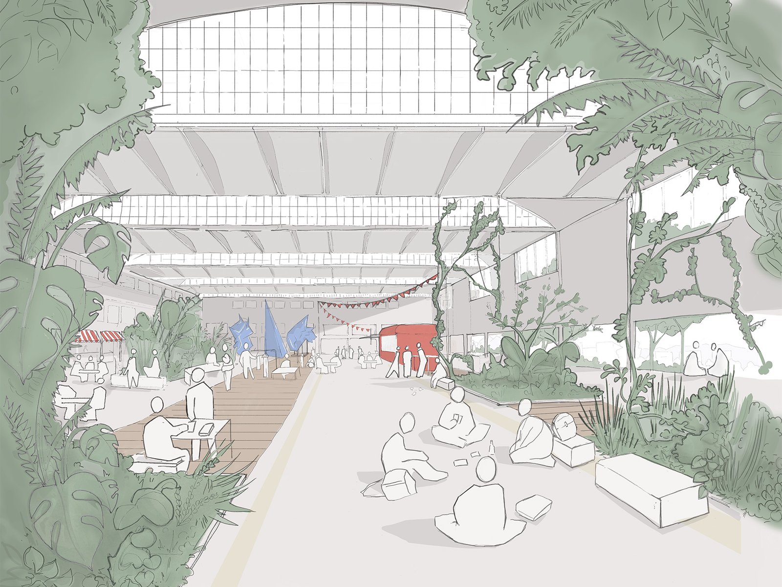halle semi-publique, mi-intérieur - mi-extérieur