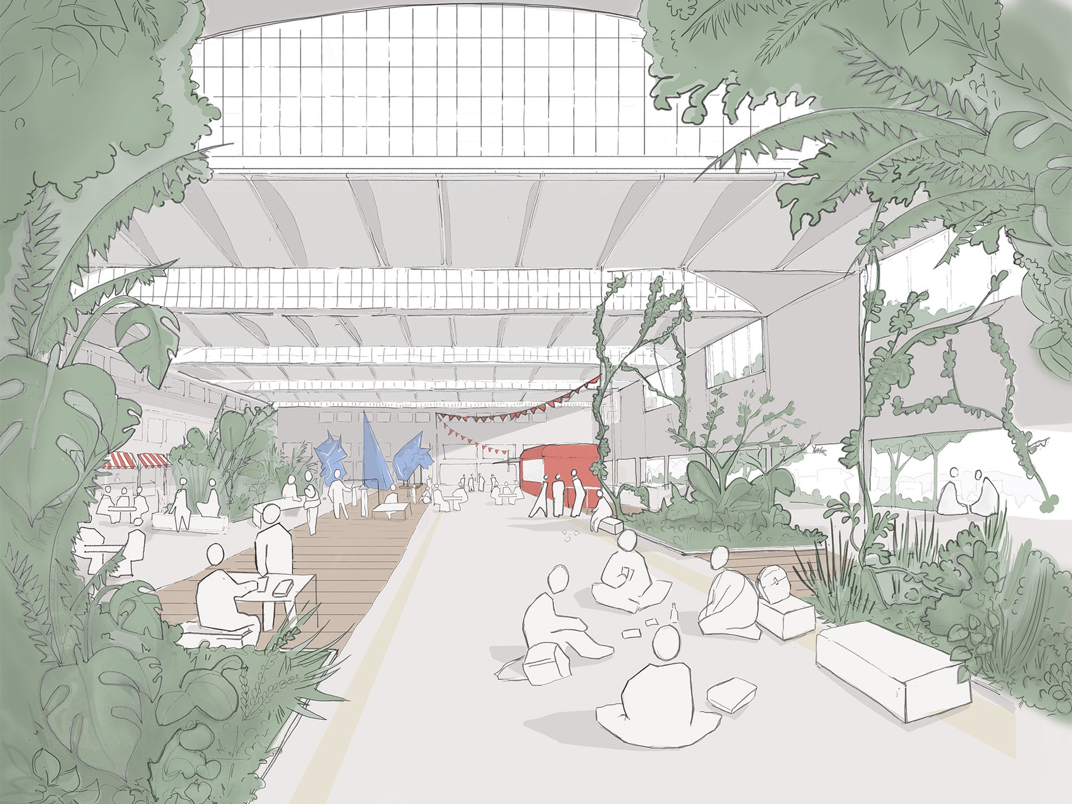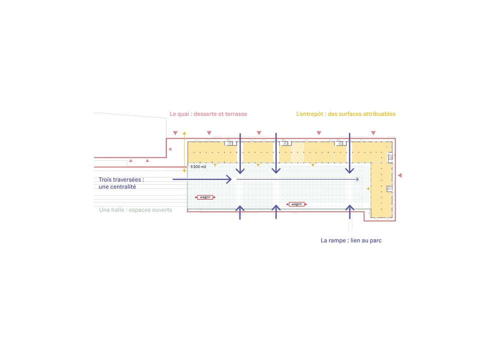 Pour revaloriser la halle, la méthodologie suivante est proposée : reconnaître les qualités spatiales du bâtiment puis définir le plan directeur et l’attitude architecturale et enfin choisir un scénario d’occupation de la gare. Les grands principes d’affectation sont d’affirmer l’espace de la Halle comme un espace vide unique où se côtoient différentes activités et d’assurer une distribution par trois accès transversaux à la halle et par les quais extérieurs.
