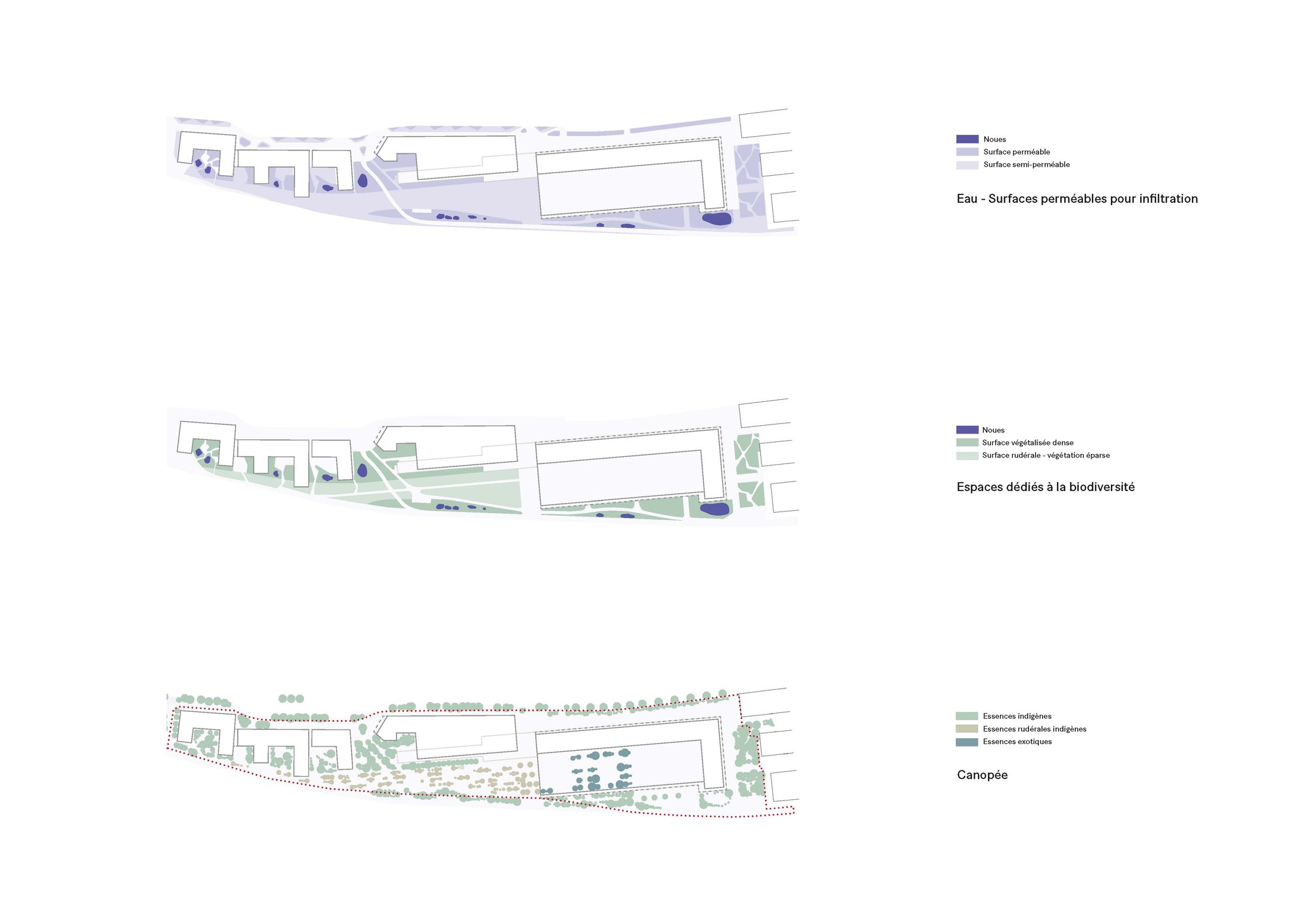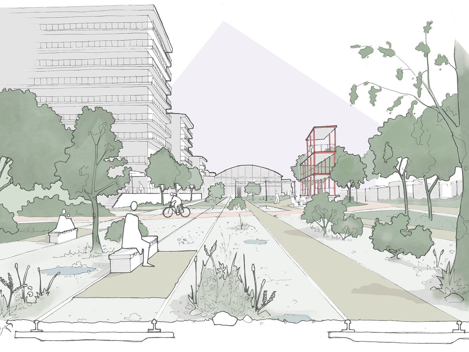 Les espaces extérieurs mettent l’accent sur une perméabilité des sols importante. Les différentes zones du site sont traitées différemment mais ces espaces sont juxtaposés pour permettre une continuité biologique. La dimension la plus importante est celle du Parc des Rails, en connexion avec la halle par une rampe d’accès ainsi qu’une perspective garantie par une végétation plus basse.