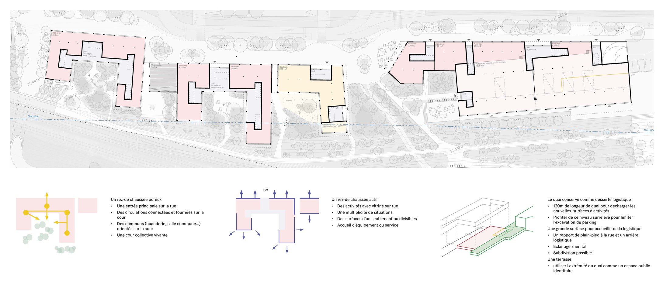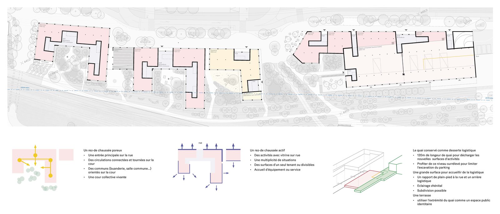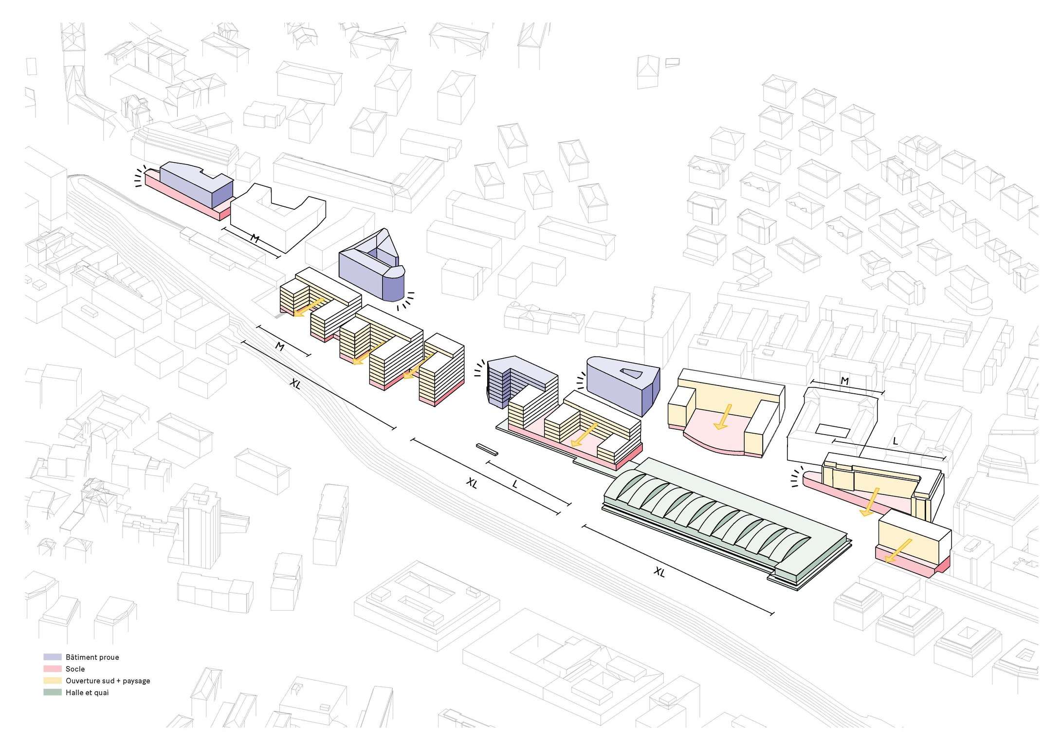 Les formes urbaines combinent deux échelles : des socles XL reprenant l’échelle de la halle et des U ouverts au sud reprenant la dimension M des îlots alentours. Le niveau 1 est plus élevé et flexible pour accueillir soit des activités, soit du logement, tandis que les rez-de-chaussée sont activés par des activités ou des locaux communs permettant des accès à des cours plus calmes. L’épaisseur et les dimensions variées des surfaces d’activités offrent une grande flexibilité d’affectations. Les logements sont traversants et/ou multipliant les orientations avec des balcons filants dans chaque cour. La halle devient un bâtiment marqueur avec son implantation en retrait de la rue, caractéristique de son usage logistique.